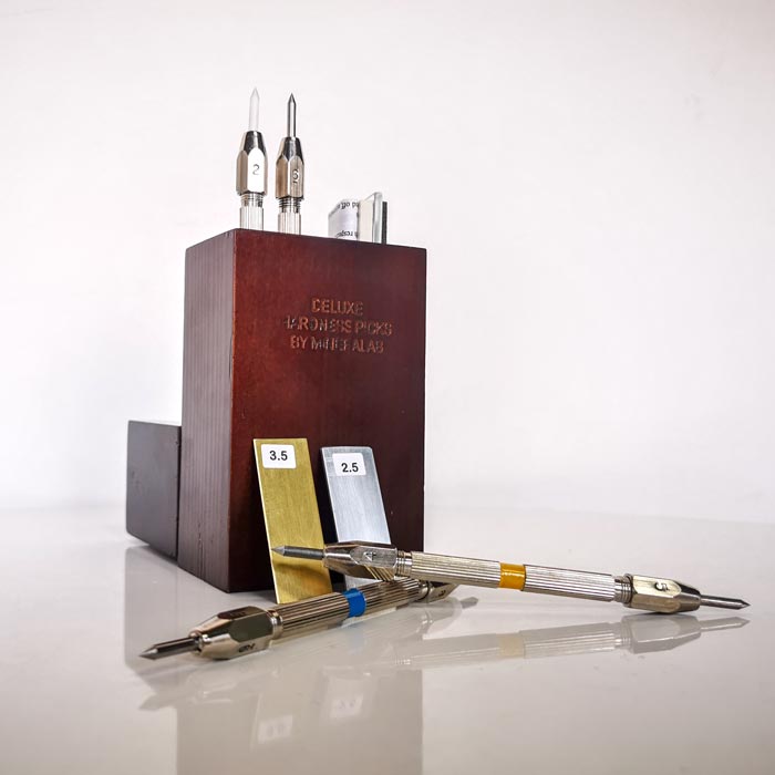 Mineralab的Deluxe Hardness Pick Set的獨(dú)特之處在于,與其他使用礦物或晶點(diǎn)的礦物硬度測(cè)試工具不同,Mineralab的硬度筆是由硬度等于莫氏硬度等級(jí)2到9的金屬和合金制成的。 而且由于硬度筆是用金屬制成的,因此很容易將它們磨削到不會(huì)折斷且很容易削尖的鋒利尖端。