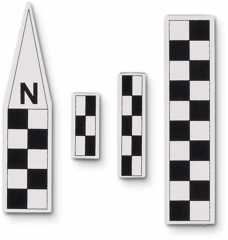 標(biāo)記長(zhǎng)度為1厘米的攝影參照尺套裝,包括一個(gè)MINI型的方向指示尺,以及長(zhǎng)度不同的參照尺。包括:一個(gè)10厘米的尺子,2個(gè)5厘米(其中一個(gè)刻度為毫米),一個(gè)3厘米的尺子,和一個(gè)MINI型的方向指示標(biāo)尺。方向指示標(biāo)尺的長(zhǎng)度為10厘米,帶刻度的部分為5厘米。